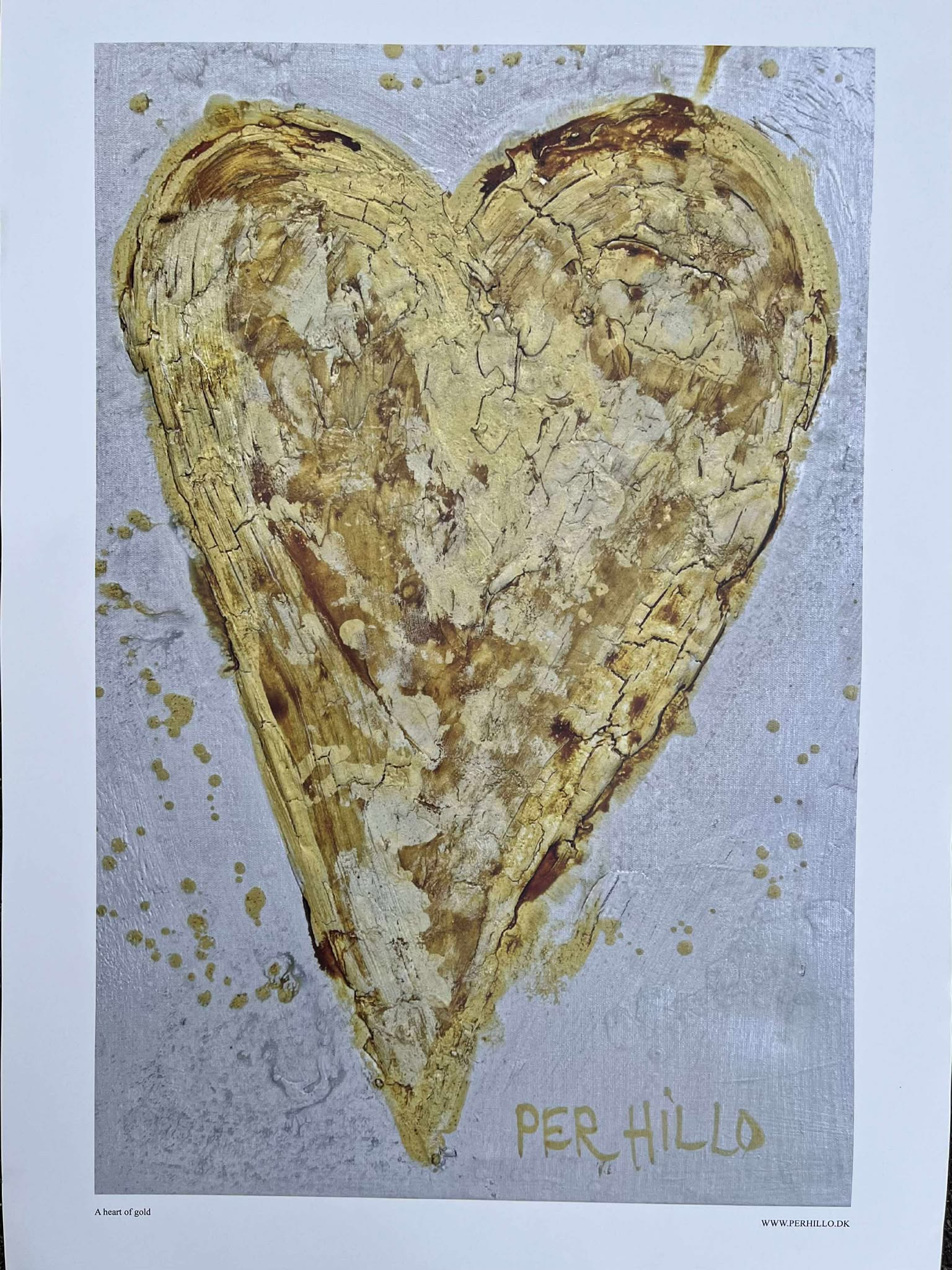 Kunstplakat 50 x 70 trykt på kraftigt blankt papir. Gråtonet baggrund med guldfarvet hjerte.